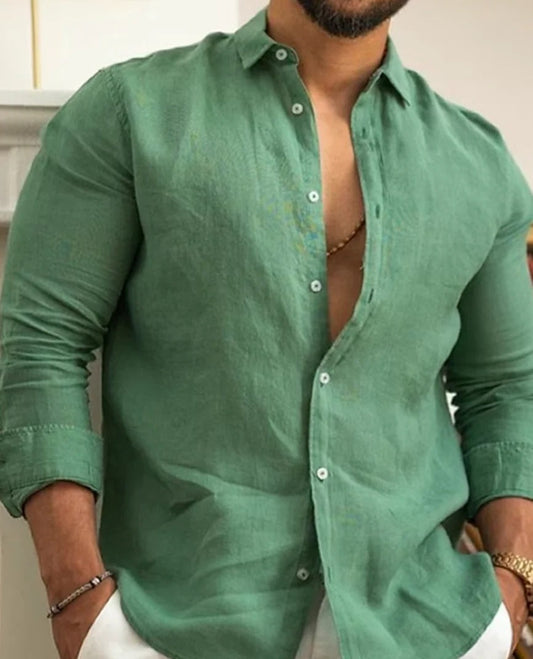 Momount Men Linen Shirt – Long Sleeve Turn Down Collar Summer Casual